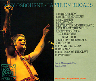 ランディ非業の死まであと2ヵ月……聴く度にその事実が胸を締め付ける、定番サウンドボード音源です。エディット・ピアフ作によるシャンソンの有名曲“薔薇色の人生”をもじったタイトルが洒落てますね。ここでの“Mr. Crowley”におけるソロプレイはまさに情熱がほとばしっているかのような勢いを感じさせ、明らかにオフィシャルで発表されたライヴ音源2種(シングル収録ヴァージョンと『TRIBUTE』の2テイク)を凌駕しています。ということで“Mr. Crowley”好きな方にはとくにオススメな音源です。曲が始まってちょうど4分のところから10数秒、約8小節にわたってキーボードの音が消える、というハプニングもあって美味しさ倍増(機材的なトラブルなのか、単にドン・エイリーが弾くのをさぼっていたのかは不明)。全編を通じてランディのテンションが落ちることはなく、数種類あるサウンドボード/FM音源の中でも特に熱く聴ける逸品となっています。難点を言えば、ジャケットのオジーが短髪(というかランディの死後剃り上げた坊主頭がやっと伸びてきた頃)で、音源の収録時期と合っていないことぐらいでしょう。もちろんオジーも絶好調、実質1曲目の“Over The Mountain”の出だしでは「お、今日は高音も結構出ているじゃないか」と喜ばせておきながらすぐにヘロヘロになっていく、というドキュメンタリー・タッチで楽しませてくれます(それでもトータルではかなり歌えている方でしょう)。なお、“Iron Man”の3:00あたりに音切れアリ。また、同内容と思われる別タイトルには『OVER THE MINNEAPOLIS』[写真下↓上 UMB (UNRELEASED MEGA BATTLE)/UM0043] や『OVER THE MOUNTAIN』[写真下↓中]、『DIARY OF A DEAD ROSE』[写真下↓下 HIGH VOLTAGE RECORDS/HVCD5008] があります。