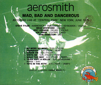 アナログブートの黎明期にリリースされた名盤『LOOK HOMEWARD ANGEL』(写真↑左:ZAP 7868)と同内容の、有名な“King Biscuit Flour Hour”音源(セントラルパークで開催されたShaeffer Music Festivalにおけるステージングを収録)を基とするCD。同内容と言っても盤起こしではなく、別マスターからのCD化のようです。同音源ブートCDの中にはコレよりも収録曲目の多いタイトルがあり、『BOSTON STRANGERS』(写真↑左から2枚目:BEECH MARTIN BM-012/022)や『LIVE EMOTIONS』(写真↑右から2枚目:MAIN EVENT ME-CD020)が全10曲を収録していた他、近年になって10曲入りであるばかりかロージェネレーションテープを使用しデジタルリマスターまで施した『NEW YORK, NEW YORK ULTIMATE FINAL REMASTERED EDITION』というアップグレード盤や、さらには放送用のリールからダイレクトに落としたと言われるまでブツ(写真↑右)までリリースされていました。正味50分弱では短い気もしますが、フェスティヴァルということを考えれば、この日のセットリストはその10曲でフルなのかもしれませんな。で、10曲モノに収録されていて『MAD, BAD DANGEROUS』では聴けない“Sweet Emotion”“No More No More”“Same Old Song And Dance”は運良く別ブート『FROM THE ATTIC OF '75』に収録されていたので、とりあえず手持ちのブートを組み合わせれば全曲拾える、ってことでアップグレード盤への買い直しは見送った次第。たった7曲と不完全収録ながらも、このShaeffer Music Festival音源のキモである“S.O.S.”〜“Somebody”の背筋ゾクゾクメドレー(つながり方がキマりすぎ)は『MAD, BAD AND DANGEROUS』でも当然バッチリだし、何よりチープなアートワークからブートらしい香りがプンプン漂ってきて、豪華なデザインであろう(未確認)アップグレード盤よりもこっちの方が楽しめること確実なのです(Track 1を“No More No More”と誤表記したり、収録日を1975年6月といい加減に書いているあたりもブートチックでグー/笑)。それにしても“S.O.S.”のエンディングで聴けるスティーヴンの喘ぎ声は放送禁止レベルじゃないのだろうか。ああ、エロいエロい。
